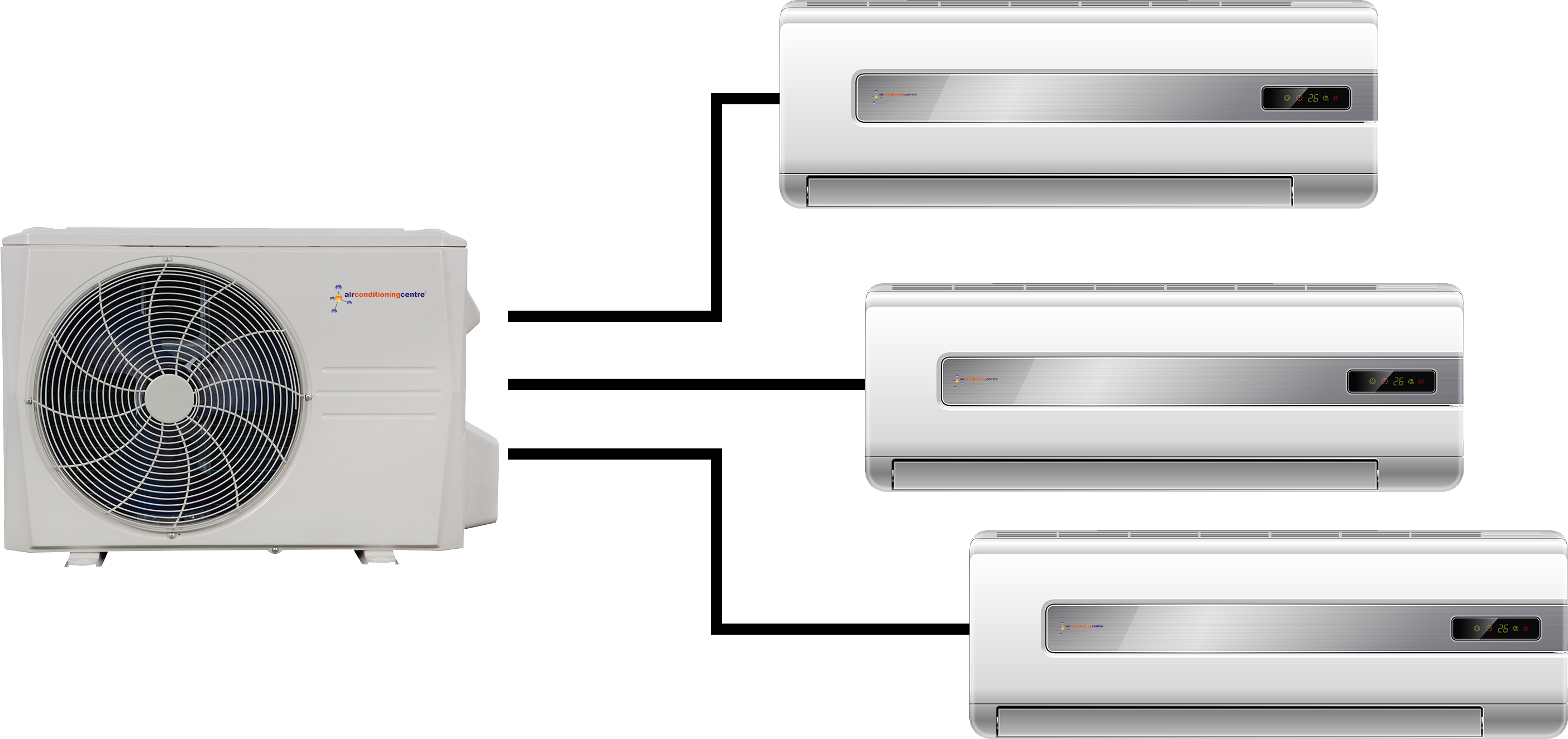 Our multi split system air conditioning units consist of one to three indoor units, sold separately, all powered by one outdoor unit, connected via copper piping. The outdoor unit contains the condenser and removes heat and condensation from the room, dissipating it outside. All our AC units are heat pumps and are able to both heat and cool.